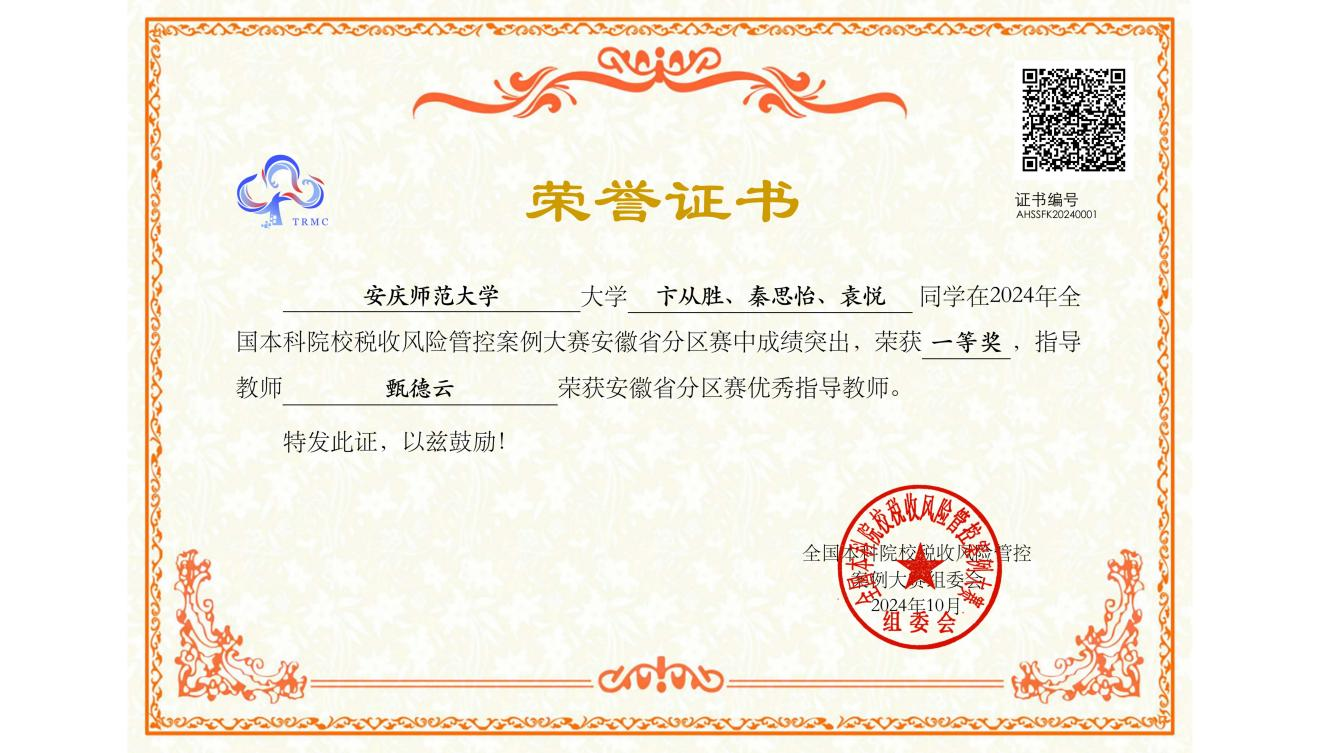 近日,2024年全国本科税收风险管控案例大赛安徽省分区赛获奖名单公布,由无码流出 卞从胜、秦思怡、袁悦三名学生组成的“V我200”团队发挥出色,荣获省级一等奖,成功晋级全国总决赛,取得了学院在该项赛事的最好成绩。指导教师甄德云荣获安徽省分区赛优秀指导教师。