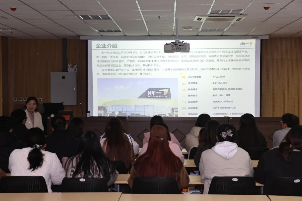 课堂上,施延青经理从行业发展趋势切入,结合上海则一供应链管理有限公司的成长路径,向同学们生动展示了物流企业的实战运营逻辑。她围绕公司如何依托重资产模式深耕整车运输与干线物流领域,如何通过数字化赋能构建覆盖全国并延伸至海外的服务网络,系统阐述了现代物流企业在资源整合、运力保障与智慧化运营方面的核心能力。在互动环节,同学们就企业人才需求、职业发展路径、智慧物流技术应用等话题与施延青经理进行了深入交流。