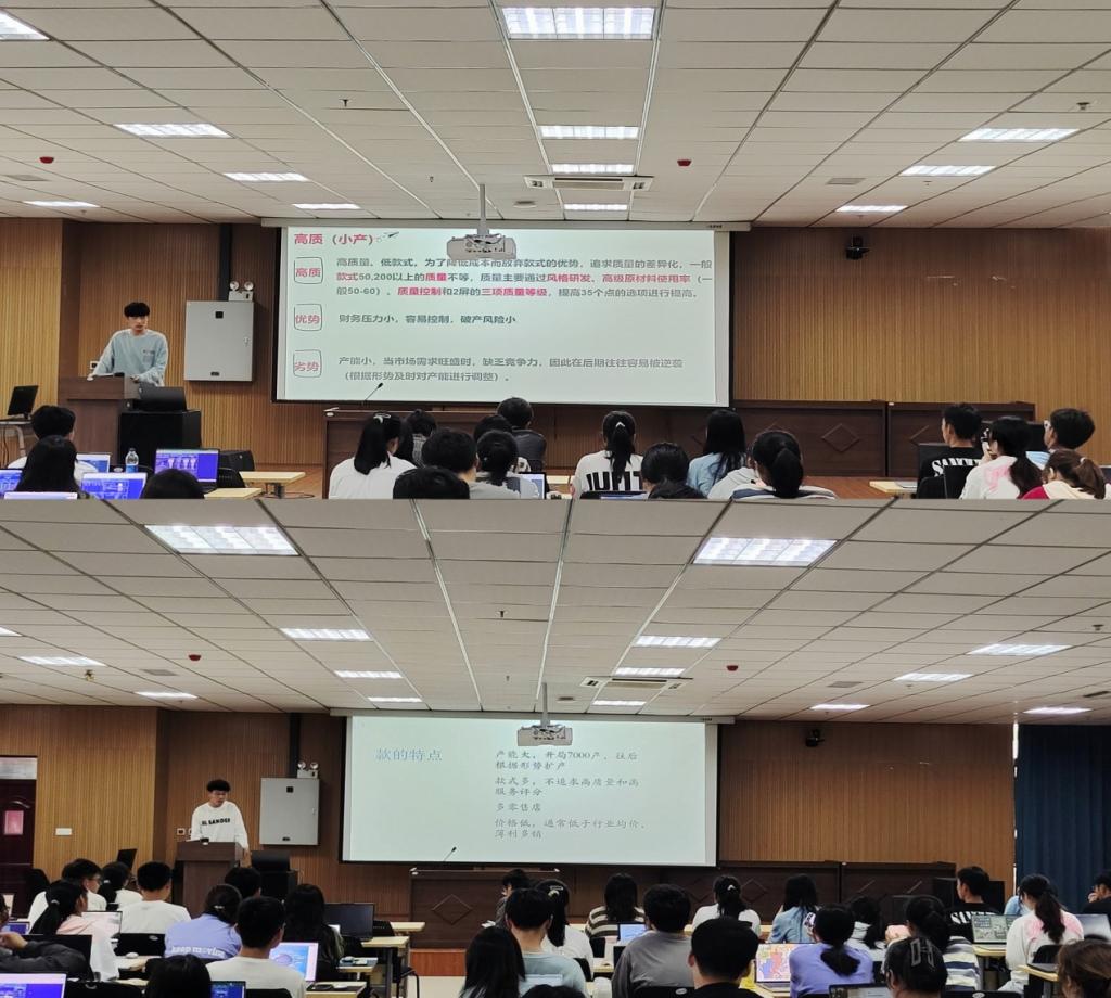 随后,全国管理决策模拟大赛总决赛获奖者、2020级物流管理专业(1)班的陈兴颖与吕诚杰同学分别分享了“以质致胜”的小产策略和“以量取胜”的大产策略。两位国赛获奖者分别围绕小产与大产策略的优劣势,解读了每种策略致胜的关键与操作要领,并现场演示了第一个虚拟经营年度的决策模拟。