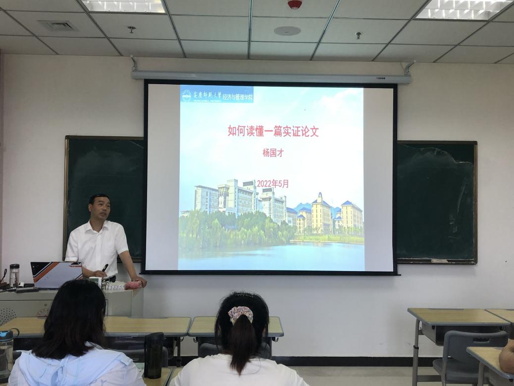 5月25日下午,学院院长杨国才教授在M306作题为“如何读懂一篇实证论文”的学术讲座,学院所有统计学研究生参会聆听。