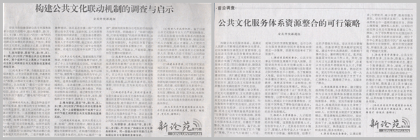 承担的横向课题《安庆市创建公共文化服务示范区制度设计》,该报新论苑栏目分别以《公共文化服务体系资源整合的可行策略》、《构建公共文化联动机制的调查与启示》为题连续刊登两篇课题阶段成果,引起了省内外公共文化领域专家学者的高度关注。