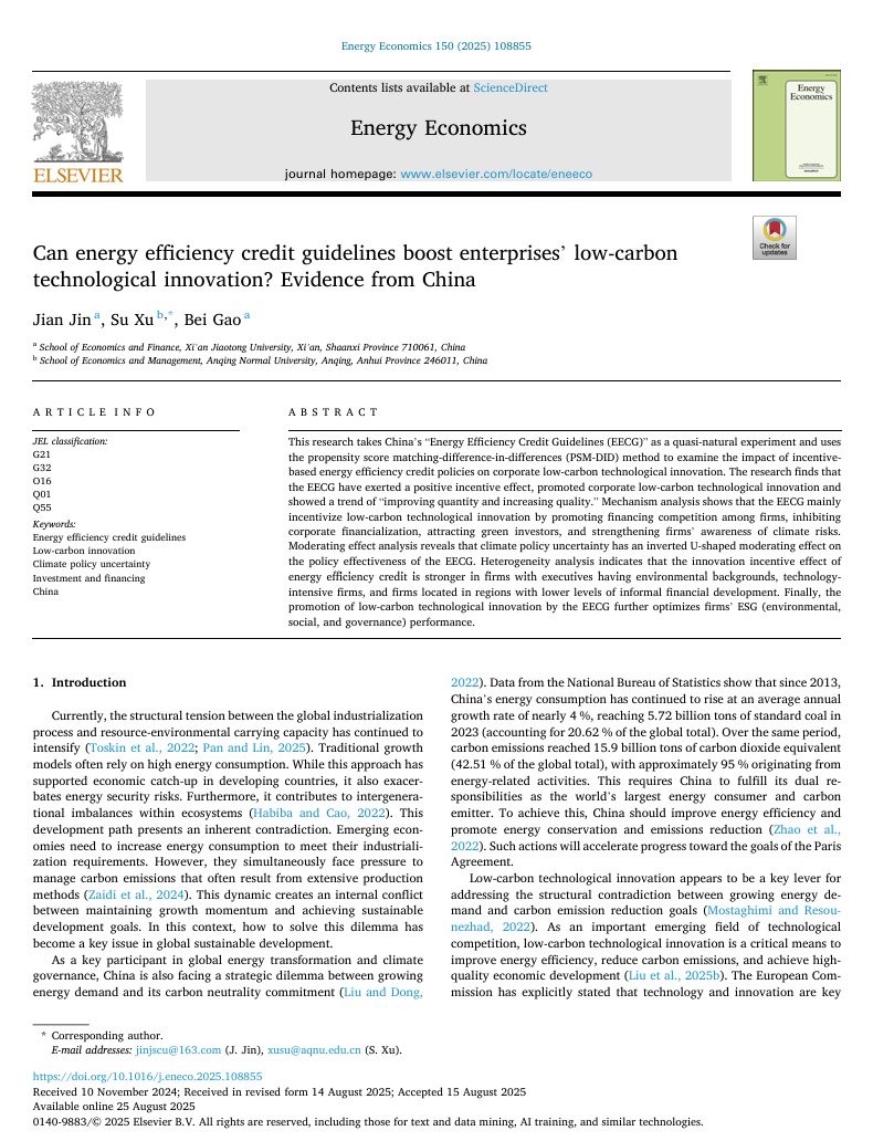 近日,电子商务教研室徐苏博士以唯一通讯作者身份在SSCI期刊《Energy Economics》发表题为《Can energy efficiency credit guidelines boost enterprises’ low-carbon technological innovation? Evidence from China》的学术论文。《Energy Economics》由国际著名出版机构爱思唯尔(Elsevier)出版,是能源经济学和能源金融领域的国际知名期刊。其发表主题包括但不限于能源的开发、转换和使用、能源商品和衍生品市场、监管和税收、预测、环境和气候、国际贸易、发展和货币政策等。该期刊2024年的综合影响因子为14.2,属于2025年中国科学院分区经济学大类一区TOP、AJG(ABS)3星级期刊。