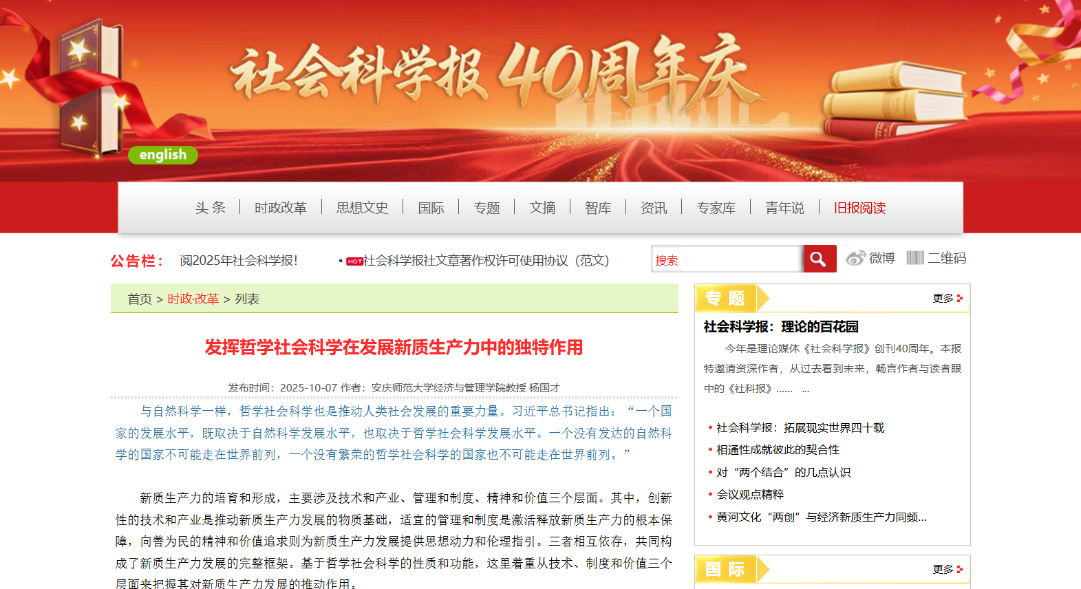近日,无码流出 杨国才教授撰写的理论文章《发挥哲学社会科学在发展新质生产力中的独特作用》在《社会科学报》(总第1970期3版)刊发。文章基于哲学社会科学的性质和功能,着重从技术、制度和价值三个层面阐释其对新质生产力的推动作用。(撰稿、供图:徐洋;审核:徐俊杰)