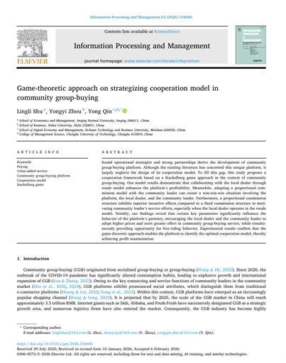 近日,物流管理教研室舒灵丽博士以第一作者身份,在国际知名权威期刊《Information Processing & Management》发表题为《Game-theoretic approach on strategizing cooperation model in community group-buying》的学术论文。《Information Processing & Management》由Elsevier出版社出版,聚焦计算机科学、信息科学等领域交叉研究。该期刊为SSCI和SCIE双检索期刊,2025年最新综合影响因子为6.9,属于中科院计算机科学大类1区Top、ABS 2星、FBS B级刊物。