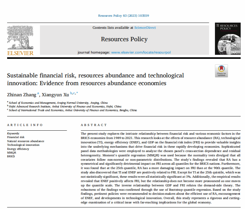 近期,金融工程教研室张支南老师以第一作者身份,在SSCI一区TOP期刊《Resources Policy》上发表了题为《Sustainable financial risk, resources abundance and technological innovation: Evidence from resources abundance economies》的学术论文。该刊由Elsevier国际出版社出版,聚焦与资源生产和使用有关的经济和政策问题,2022年综合影响因子为8.222,属于中科院分区经济学大类的TOP刊物。