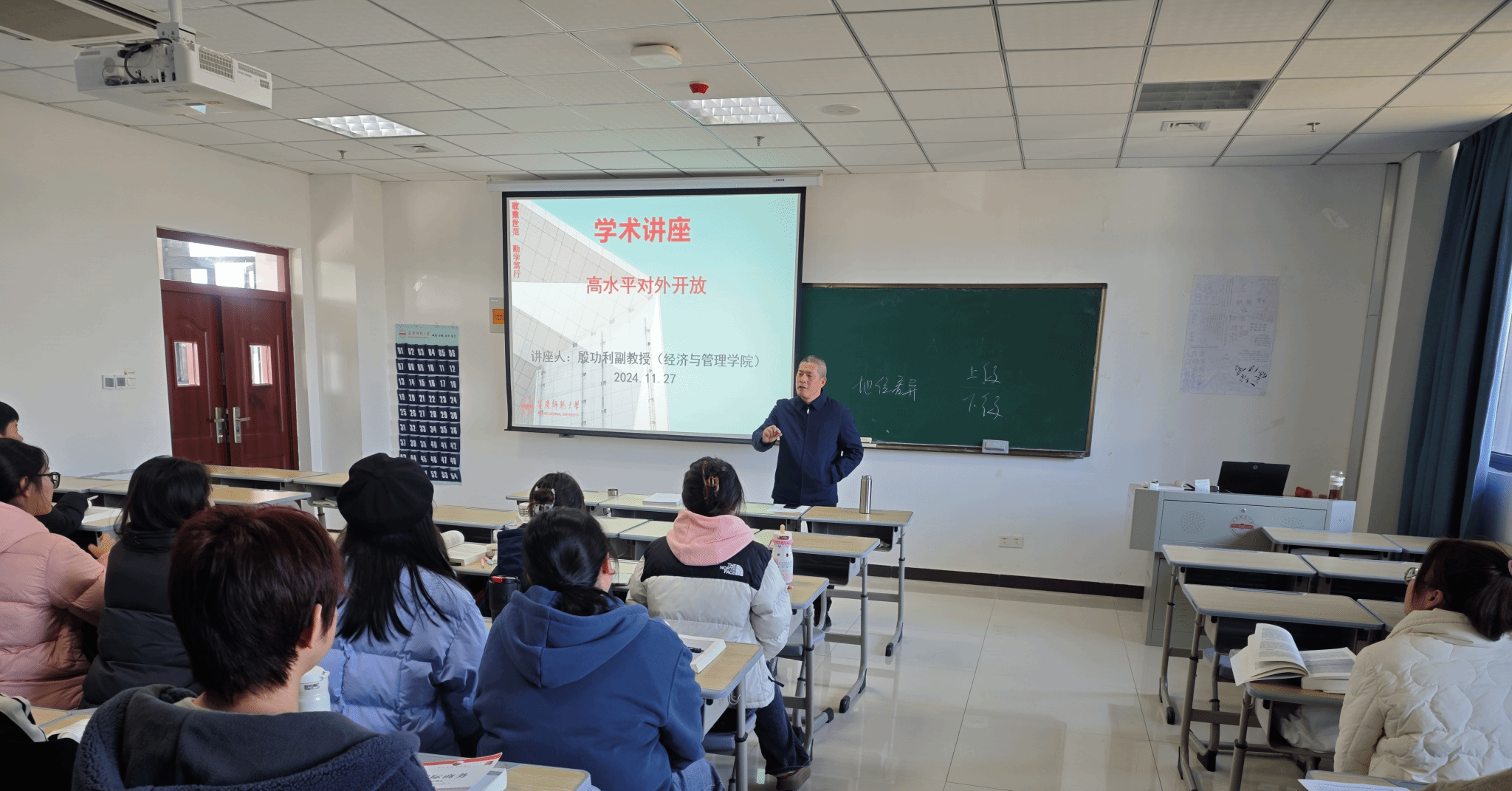 11月27日上午,殷功利副教授在M305作题为“高水平对外开放”的学术讲座,*无码流出 国际商务硕士研究生参会聆听。