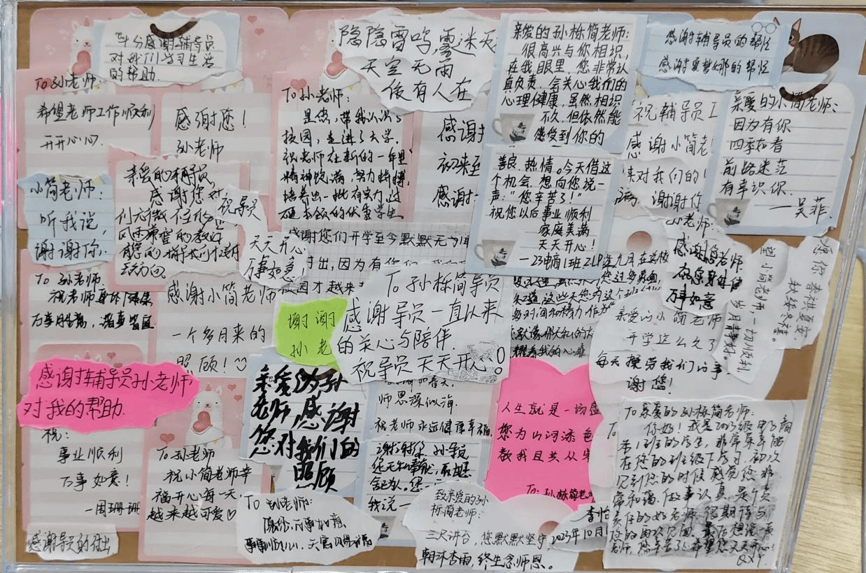 同学们寄情于笔墨,在一张张便利贴上写下对新生班辅导员的感激,“愿您事事顺心”“您为山河添色,教我且共从容”“朝沐杏雨,终生念师恩”……每个人都挥洒笔墨,书写最诚挚的感情。从便利贴到明信片,同学们一笔一划地写下对老师的感恩,写好的便利贴会被贴到相框中,送给新生班辅导员。