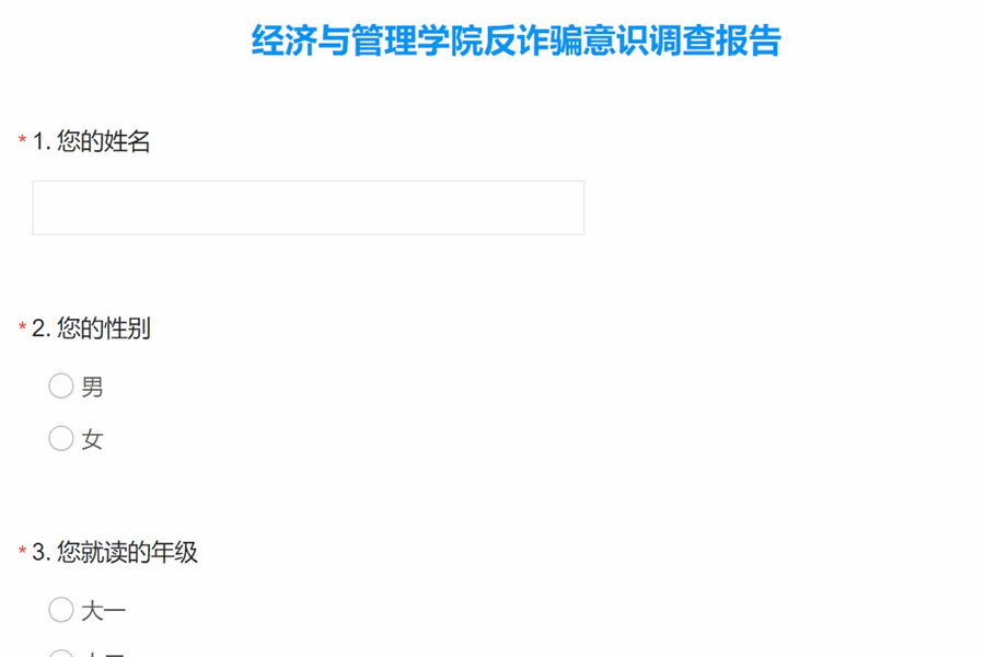 此次反诈问卷调查活动旨在了解同学们对于诈骗现象的认识以及同学们在生活中遇到过哪些诈骗行为,通过本次反诈骗意识问卷调查活动,有效帮助同学们增强反诈骗意识,更好地保护自己和家人的财产安全。学院将继续开展相关的宣传教育活动,引导学生树立正确的安全观念,加强反诈骗意识,共同构建安全、健康的无诈校园环境。(撰稿:方曼丽 孙成成;摄影:方曼丽 桂学涛;审核:周毅)