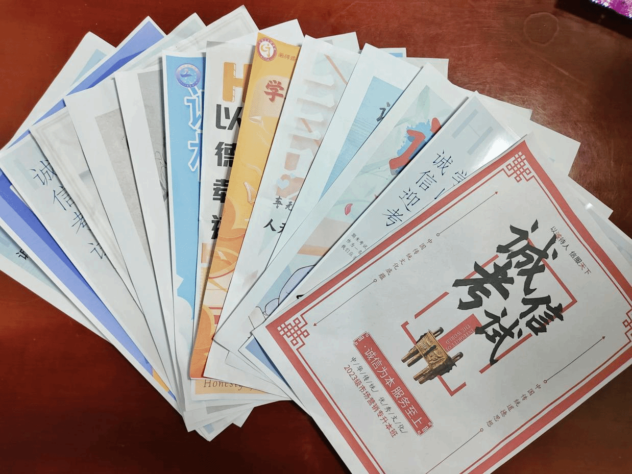 学院开展诚信海报设计活动。各班级发挥奇思妙想,设计出创意十足又紧扣诚信考试主题的海报。海报设计活动不仅展示了同学们的设计才华,更传递了诚信考试的价值观。