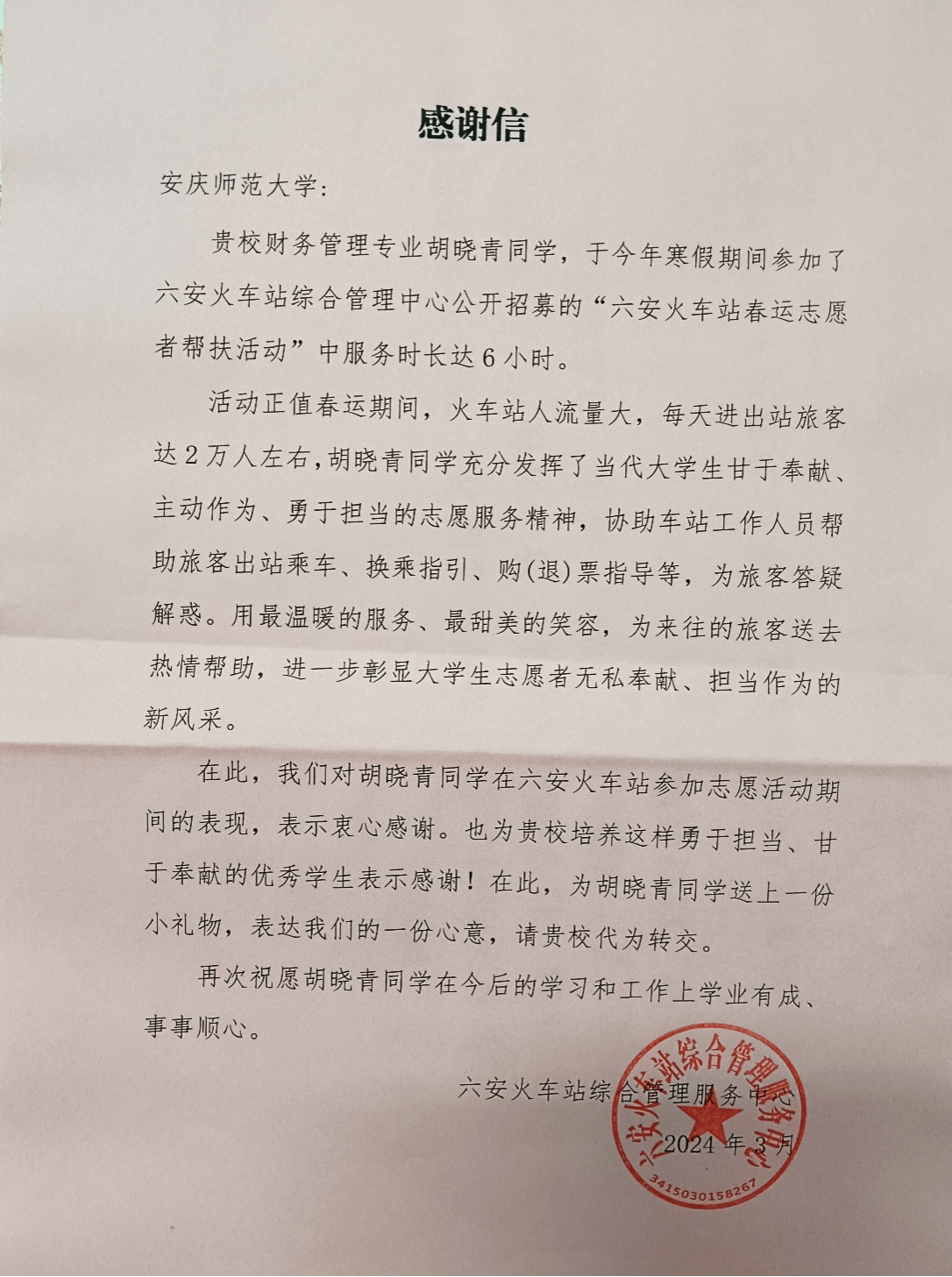 2022级财务管理2班的胡晓青同学在寒假期间积极响应家乡需要,参加春运志愿者帮扶活动表示感谢。