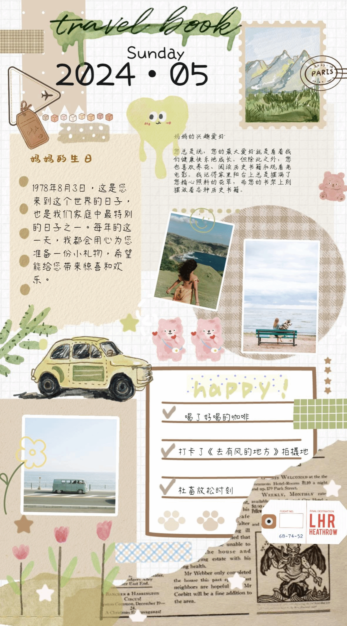 同学们精心制作了风格多样的亲情手账,有的清新自然,有的可爱浪漫,还有的以生动的表情包幽默地传达爱意。在这些手账中,同学们详细记录了与母亲的合照、和母亲共同经历过的趣事、学生对母亲的祝福、母亲的生日、母亲的爱好和喜欢的事物等内容,有的还附上了如“岁月匆匆,母爱深深;感恩有您,伴我成长”等温馨的祝福语,表达自己对母亲的感激和爱意。
