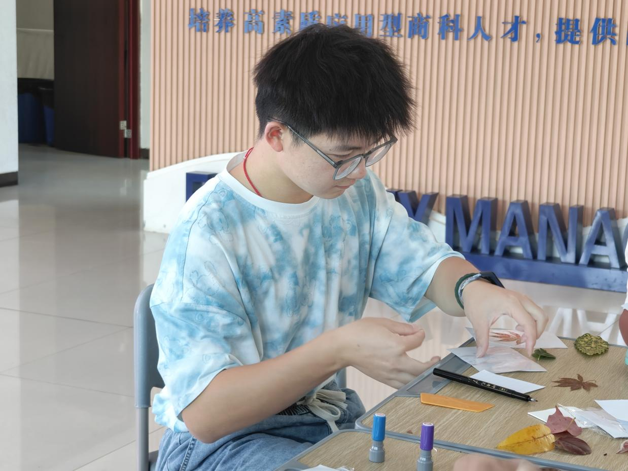 收集树叶、发挥想象能力、自由搭配、细心制作……工作人员引导同学们使用冷裱膜对树叶进行塑封,大家充分展示了自己的创作与搭配能力,让剪刀与刮板在指尖跳跃,勾勒出自己心中的愿景。为确保参与学生获得最佳的动手体验,活动负责人、工商管理专业2023级(1)班高俊提前半个月筹划活动流程。“在收集和制作的过程中,一方面增强了我的动手能力,另一方面提高了我的环保意识,让我从中感受到了乐趣。”工商管理专业2023级(3)班吴志美同学在制作完成后兴奋地表示。