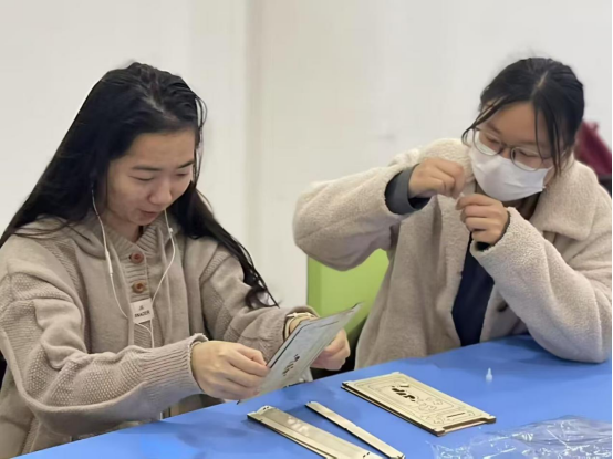 活动现场,同学们使用竹骨、彩纸、丝线等传统材料认真仔细地拼接宫灯部件,先将灯芯装入其中,再挂上流苏和灯杆,一个个精美的宫灯就制作完成了。从骨架搭建到图案绘制,大家全神贯注,细致雕琢每一处细节。同学们相互交流制作心得,现场不时传来欢声笑语。