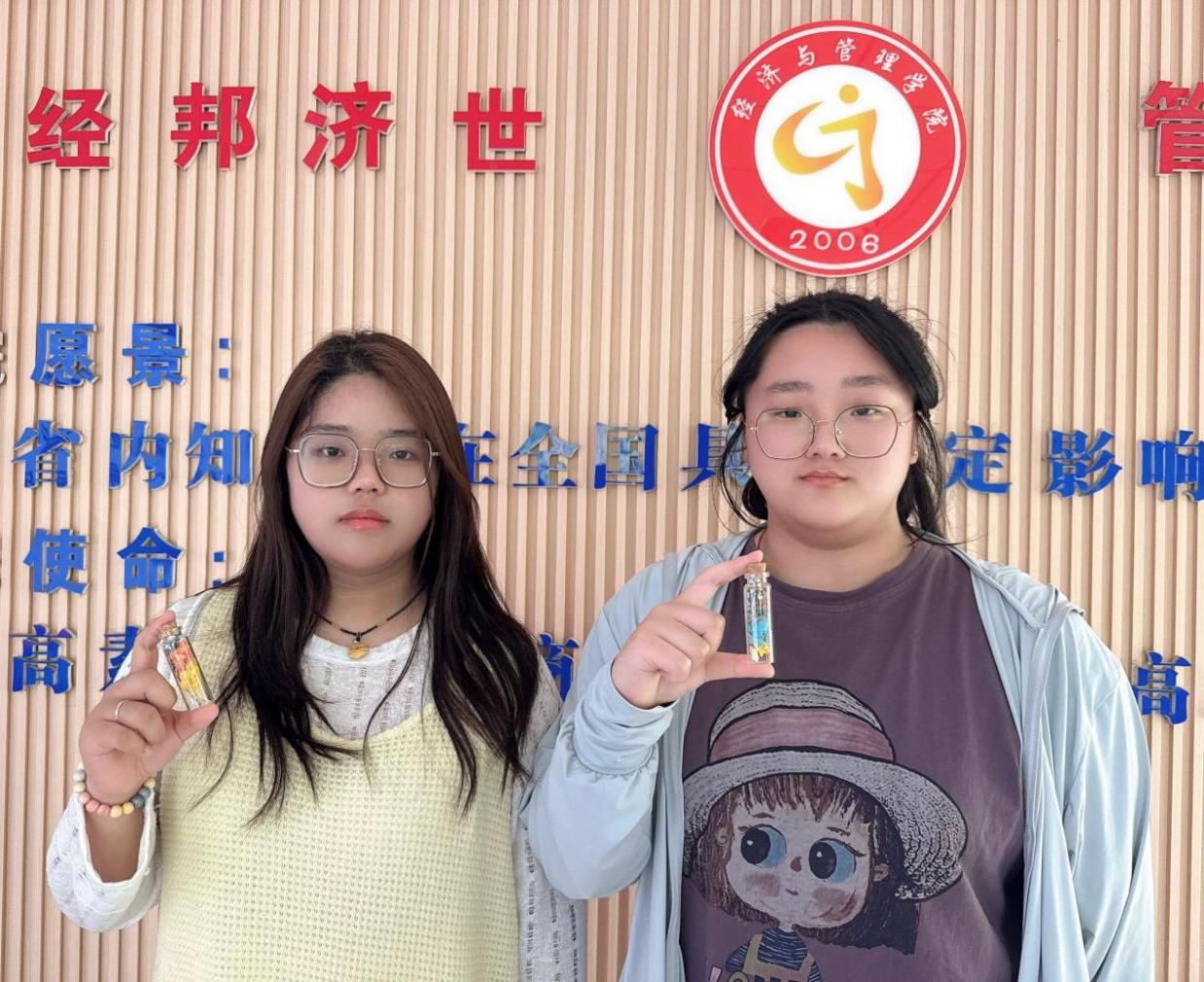 手执玻璃细挑选、编织干花释压力、分享心事互倾听……工作人员引导学生使用干花在玻璃瓶里进行创作,同学们充分展示自己的创作,表达内心想法。工商管理类专业2024级(2)班的郭笑彤同学表示:“在挑选自己心仪的干花和思考如何创作中,让我在释放情绪压力的同时体验到了感受到了创作的魅力。”财务管理专业2023级(1)班的李嘉怡同学在完成创作后兴奋地说道:“通过这次活动,我不仅缓解了压力,还结识了一群志同道合的朋友。”