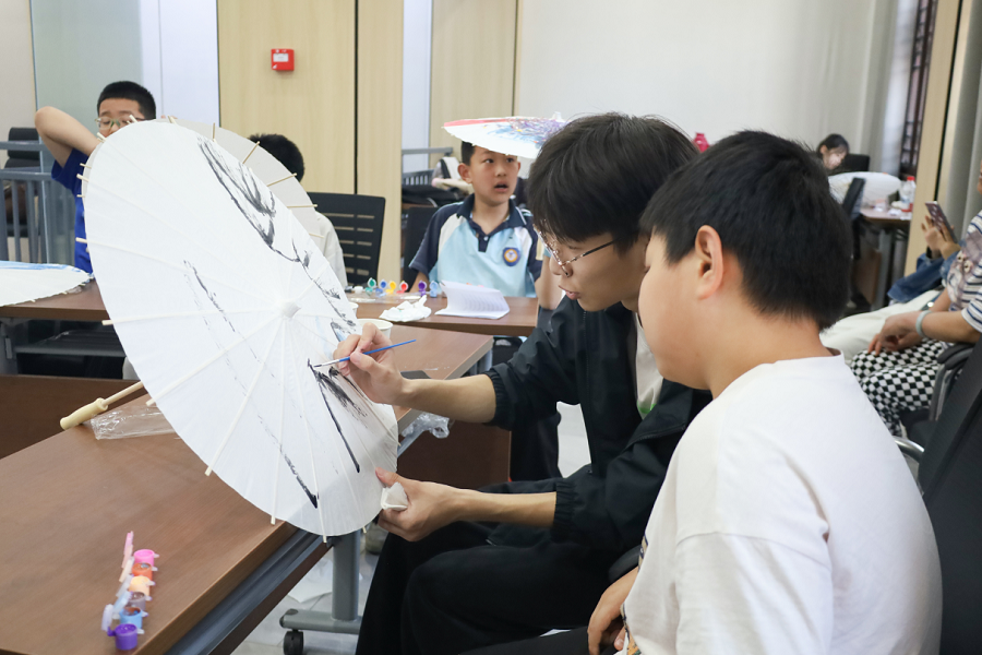 “先撑开伞面,再根据构思调试颜料,上色过程要有耐心不能急躁。”教学过程中,志愿者、电子商务类专业2024(1)班的汪浩边示范边讲解。谈及准备工作,这位已有绘画功底的“小老师”说:“提前三天就开始琢磨配色和笔法了,希望能为社区参与者带来最佳体验。”在他一笔一划的耐心指导下,一幅虚实相生的山水图景悄然“绽放”在五年级(2)班丁文博的画纸上。