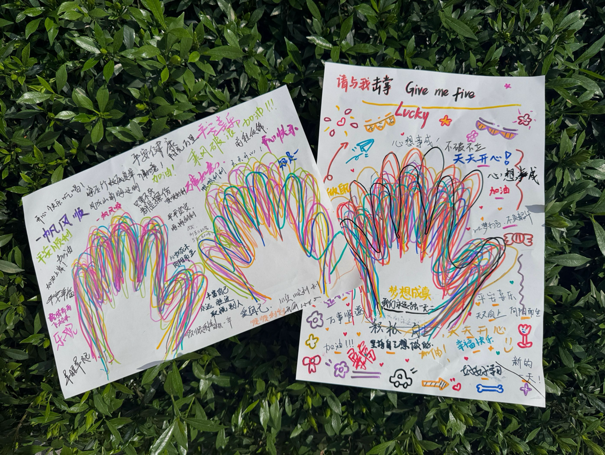 活动现场,同学们热情高涨,在工作人员引导下,纷纷拿起笔精心挑选色彩,专注地在纸上勾勒手掌印轮廓。很快,红、橙、蓝、绿等缤纷色彩的手掌印错落分布,形态各异。大家还发挥创意,在一旁写下“保持热爱,奔赴山海”“每一步努力都算数”等励志话语。财务管理类专业2023级(2)班的孙良园兴奋地说:“亲手绘制手掌印,把心里的压力都释放出来了,看着一张张充满色彩和文字的纸,感觉充满力量,和同学们一起创作的过程太有趣了!”
