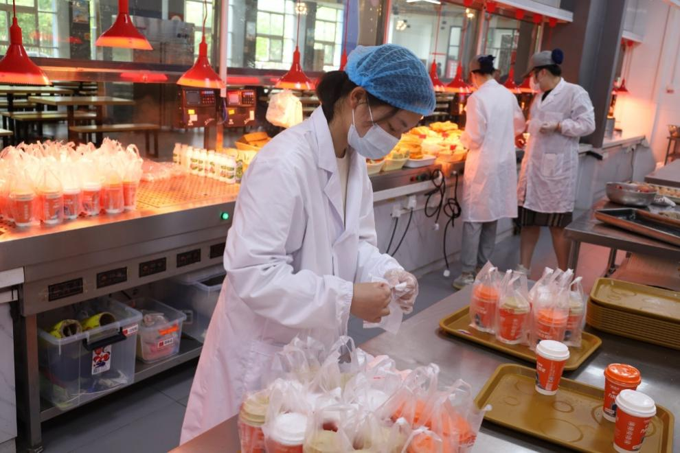 “同学你好!想吃什么?”“一个华夫饼、一个煎饺和一个鸡蛋”。国际经济与贸易专业2021(1)班的凌雪儿同学穿上白色员工服、带好口罩与手套,头发扎进蓝色工作帽,化身食堂“打饭人”,尽显“专业范儿”。 面对备餐台上琳琅满目的早点品种和两个窗口前的4条“长龙”,以及准确且迅速地算出“花式”搭配、“繁琐”数目的早点总价对凌雪儿同学来说是“一大难题”。“刚刚分装早点、算价格的时候我还不太熟练,多亏阿姨在一旁指导我”,凌雪儿同学表示,从“干饭人”到“打饭人”,角色的转换对于自己而言不仅是一次全新的体验,更是一次难得的锻炼,自己也切实地体会到了食堂工作人员日常的辛苦。