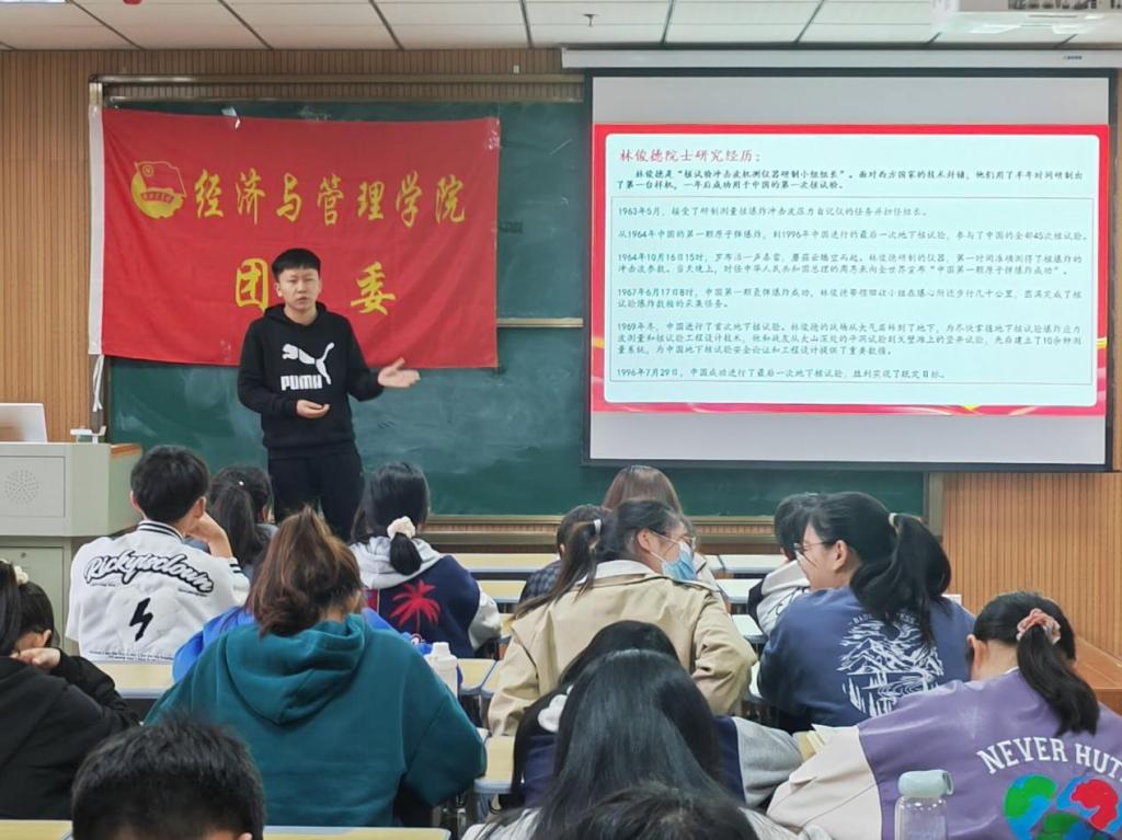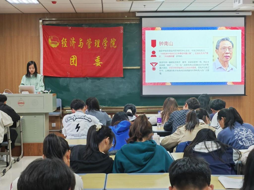 各小组代表分别和与会同学们分享了新中国成立以来在各个领域做出突出贡献的杰出人物事迹,以及小组学员的个人心得。如,2021级工商管理专业方博雅同学介绍了钟南山院士的父亲——儿科医学专家钟世藩致力于临床和实验研究,取得免疫单向扩散技术的事迹,方博雅说,“通过这次报告,让我也真正走进了钟世藩教授,他的事迹不仅让我们感受到炽热的爱国热情,更是从中学习了他严谨的工作态度和开拓进取的科学精神”;2020级物流管理专业刘元同学采用了问答方式分享了“杂交水稻之父”袁隆平院士培育杂交水稻的科学成就以及培养科研人才的重要贡献,刘元说,“袁爷爷的事迹展示出了最淳朴的爱国主义情怀,蕴含着钢铁般的意志,他把自身的兴趣志向与国家的迫切需要和命运前途紧密地结合在一起,这样的精神和意志品质是我们青年大学生学习的榜样”。