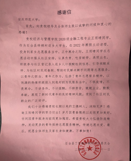 收到一封来自池州市石台县丁香镇梓桐村村民委员会的感谢信。信中介绍了2020级金融工程专业王雨晴同学主动与抗疫志愿服务的先进事迹,并对无码流出