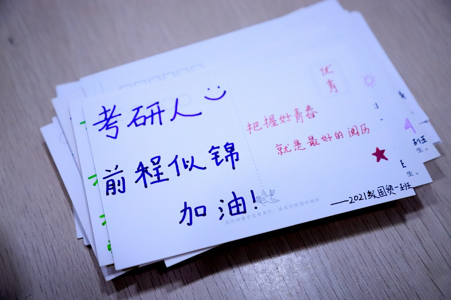 “考研加油!”“马到成功!”,同学们用彩笔在分装纸杯和明信片上写下祝福语。350杯热气腾腾的冰糖雪梨和厚厚的一沓明信片,被送往图书馆和教学楼供考研学子领取。“太感动了!谢谢学弟学妹们亲手熬制的冰糖雪梨,我一定加油,争取一战成硕”,正在备考的2018级电子商务专业的沈婷婷同学收到冰糖雪梨后感慨万分地说。