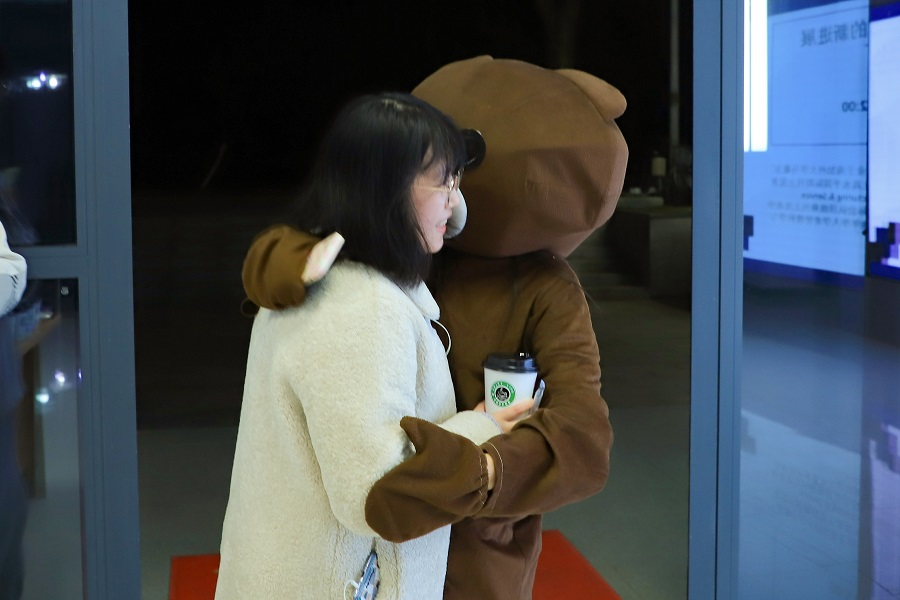 在现场,一只身穿写有“经管”二字红色外套的玩偶熊格外引人注意,时不时摆出可爱动作的小熊,还会给前来领取冰糖雪梨的考研学子一个“爱的抱抱”。这让正在备考的2018级金融工程专业的许文彤同学直呼“太暖心了!”,她坦言这拥抱很温暖,让她觉得自己不是在孤军奋战。不少考研学子表示,在考研冲刺阶段,复习备考压力大,但是收到老师和学弟学妹们的祝福,让他们觉得奋斗的路上并不孤单。