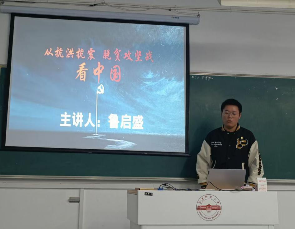 生活委员鲁启盛为同学们讲解抗洪救灾和脱贫攻坚战中的共产党精神