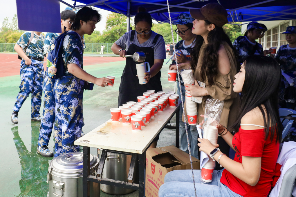 新生辅导员们心系学生身体健康,在东苑第二食堂熬制姜茶并送往军训场地,为学院268名新生驱散寒意。