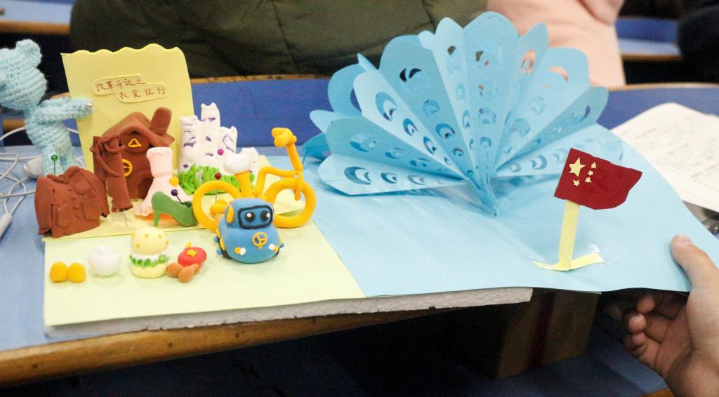 在C303教室举办庆祝改革开放四十周年系列活动之“妙手生花”手工大赛。本次比赛以改革开放为主题,共收到了12组优秀作品。