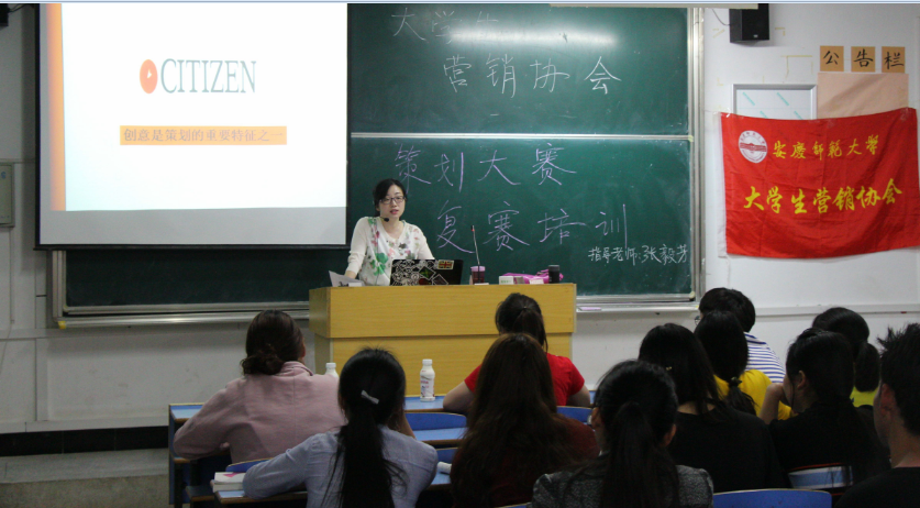 会议伊始,张毅芳副教授上台为大家进行指导,首先她认可了各队在初赛中的出色表现并表达了对复赛及决赛的期待,同时就策划是什么、策划书包括什么、如何完成一份优秀的策划书等问题进行了充分的讲解,她说我们要明确策划的目的,研究产品的特点和竞争对手,明确产品卖点,策划应做到有创意、有目标、有可能。其中,张老师通过对福特汽车公司销售野马汽车,万宝路香烟如何实现从女性香烟转型为男性香烟等实际案例的举证分析,清晰明了的从市场分析,市场定位等方面为大家进行了指导。随后,财务管理专业赵雅倩上台进行发言。赵雅倩同学首先就现场情况有感而发创作了一首顺口溜,赢得全场掌声,活跃现场气氛。紧接着她总结了自己队伍的比赛经验,强调了团队合作的重要性,并分发了策划书样本供大家参考学习,提出比赛中会经历很多,也会收获很多,这其中团队的协作至关重要,队伍间要明确分工,共同努力。最后,大学生营销协会会长李厚雪上台对大家的到来表示欢迎,他对各队在初赛中获得的优异成绩进行了赞赏并发放了奖金奖励,并对复赛规则进行说明,作总结发言,培训大会在掌声中落下帷幕。