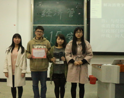 本次活动分为四个环节:个人必答,集体必答,观众互动,抢答。活动伊始,主持人进行了活动流程叙述,由15级金融工程1班、15级金融工程2班、15级财务管理1班、15级物流管理2班、15级市场营销班五支参赛队伍依次进行着自我介绍。紧接着,活动紧张而有序的进行着,各位选手思维敏捷,逻辑清晰,都纷纷展示出了自己丰富的维权知识。活动在五支代表队激烈的抢答与观众互动中达到高潮,各队优异的表现赢得了观众的热烈掌声。最后,活动根据各环节总分最终角出一、二、三等奖,分别是金融工程2班代表队、金融工程1班代表队、物流管理2班代表队,来自金融工程2班代表队的王广博同学还获得“最优秀选手”荣誉称号,此次活动终于圆满落幕。
