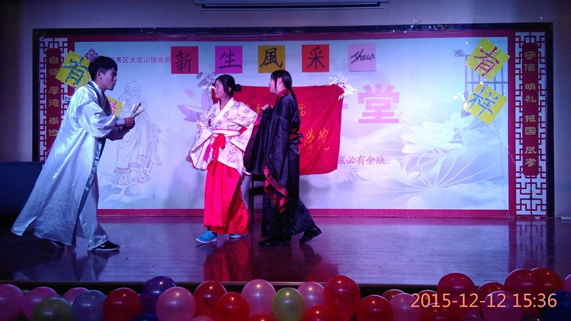 随后,“三人行”队为大家带来了诗朗诵《青春过往》。“神仙姐姐”队的话剧《恶搞版灰姑娘》,诙谐的反串表演,引的全场笑声不断。“逐愿”队带来了小品《朋友?朋友》。“heartbeat”队带来了话剧《15版梁祝》,演员们古装上阵,全新演绎了千古绝恋。“文艺萌宝儿”队带来了一段文艺歌舞。韩龙老师在现场演唱了一首自创歌曲《向前走》,他鼓励同学们在今后人生道路上学会坚持,勇往直前。
