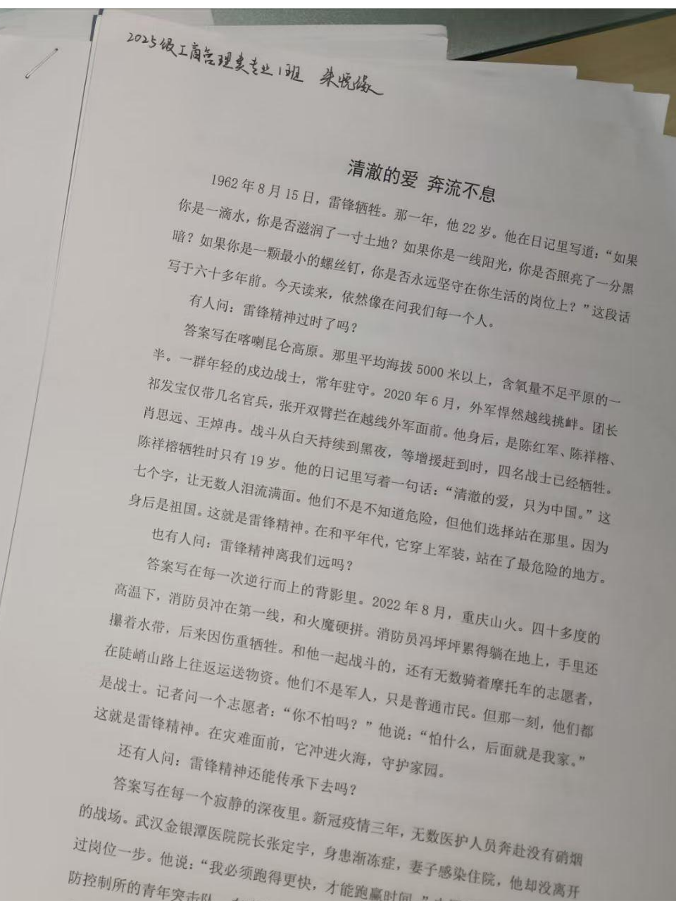 为深入传承弘扬雷锋精神,引导青年学子将雷锋精神融入专业学习与青春实践,厚植奉献担当情怀,近期,学院举办“笔墨抒初心,薪火传雷锋”主题征文比赛。全院学子踊跃参与,以文寄情、以笔抒怀,用文字诠释新时代雷锋精神的内涵与价值。