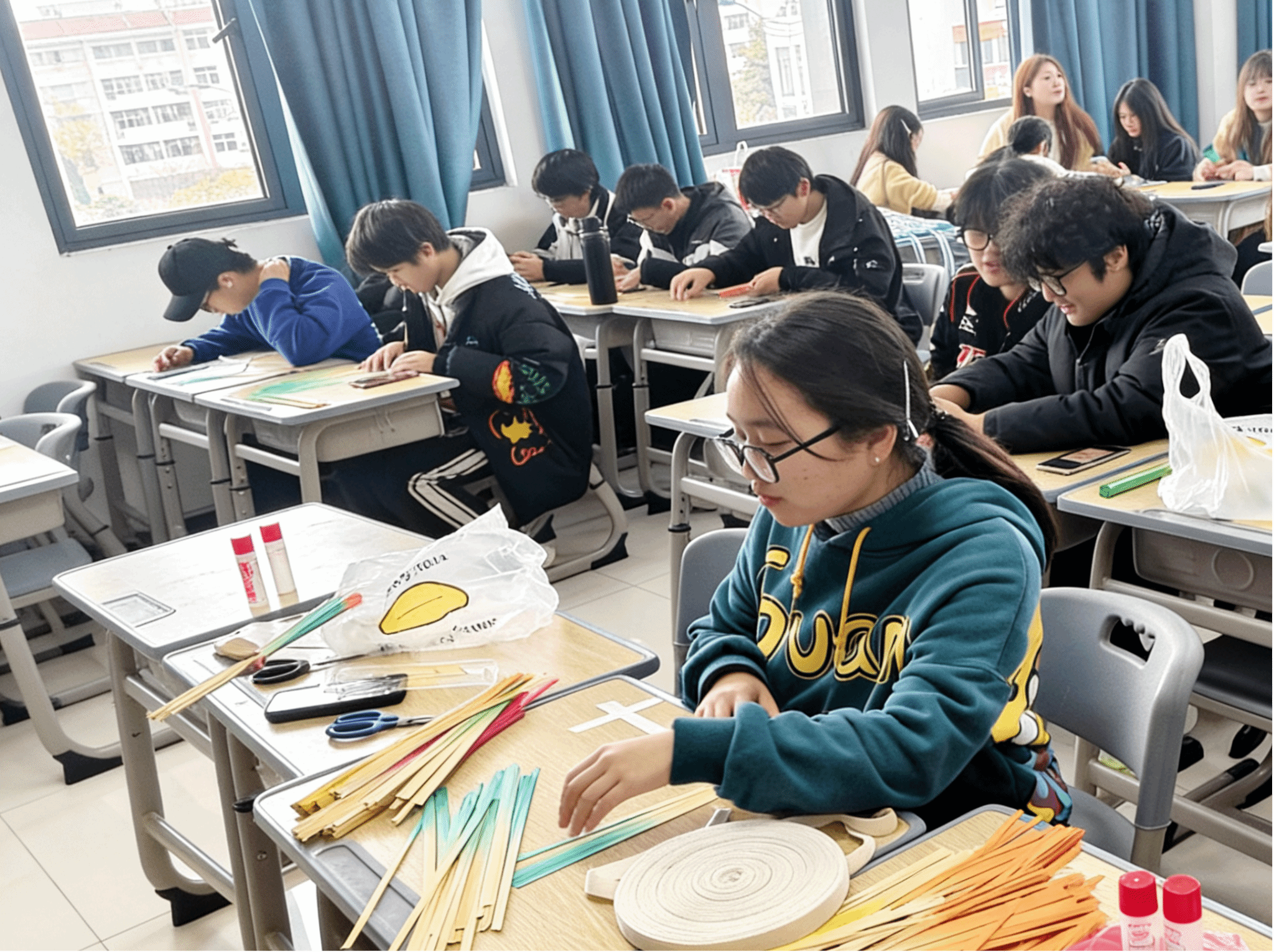 活动现场,同学们围坐桌旁,桌上整齐摆放着竹条、剪刀、胶水等工具。大家从基础的“挑一压一”编织技法学起,逐步完成自己的竹编作品。有的同学专注编织六角形底座,有的尝试制作竹编小扇,现场氛围热烈而有序。过程中,同学们相互交流技巧、分享创作心得,既锻炼了动手能力,也增进了团队协作意识。