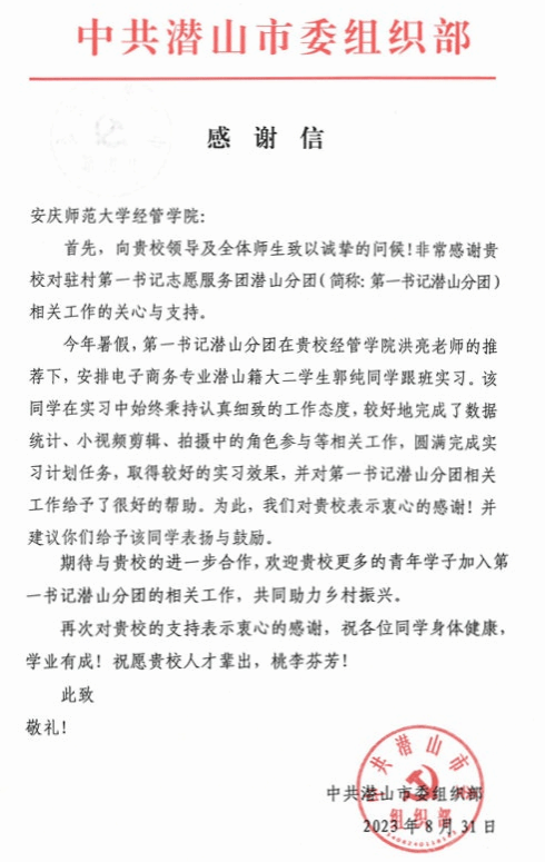 发来感谢信,对学院选派电子商务专业学生协助该市打造“第一书记潜山分团”IP抖音号表达谢意,并提议学院对具体承担这项工作的郭纯同学进行表彰。