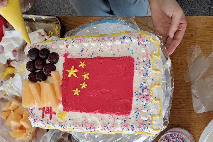 现场气氛温馨,同学们分工明确,从准备蛋糕胚、发放工具,到抹奶油、裱花,大家共同制作了顶层图案为五星红旗、侧面是长城轮廓的大蛋糕。最后同学们在活动现场一起合影留念,记录着难忘的时刻。2021级财务管理专业2班汪欢表示:“这次活动带给我一种全新的体验。我和同学们一起动手制作了国旗生日蛋糕,祝福祖国生日快乐!祝愿我们的伟大祖国欣欣向荣,国泰民安!”