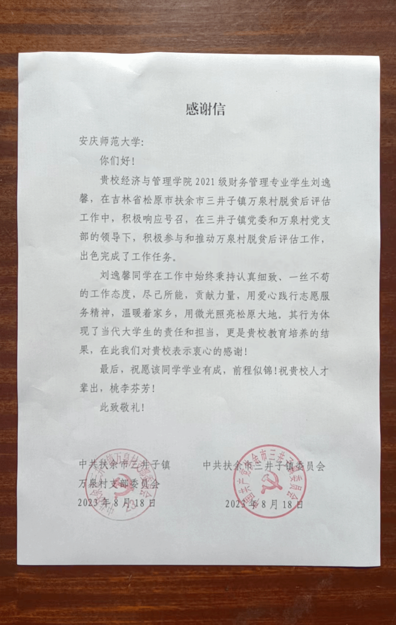 收到了一封来自吉林省扶余市三井子镇的感谢信。信中对无码流出