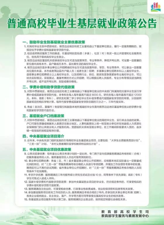日前,教育部办公厅印发《教育部办公厅关于开展2022年高校毕业生就业创业政策宣传月活动的通知》(教学厅函〔2022〕7 号),于2022年4月组织开展高校毕业生就业创业政策宣传月活动,编发系列政策公告,帮助更多高校毕业生知晓各项促就业政策,促进高校毕业生更加充分更高质量就业。下面让我们一起来看教育部印发的“普通高校毕业生就业创业政策公告”吧~