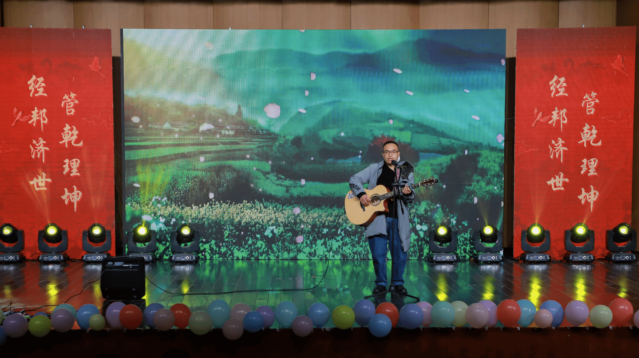 学院的老师们也参与到表演中,李裕鸿老师带来的歌曲《最远的你是我最近的爱》将全场气氛推向高潮,刘鹏飞和李颖老师的歌曲《我们都是追梦人》更是作为压轴节目最后出场。现场观众纷纷挥舞着双手,有节奏地打着节拍,营造了师生共乐的和谐欢乐氛围。