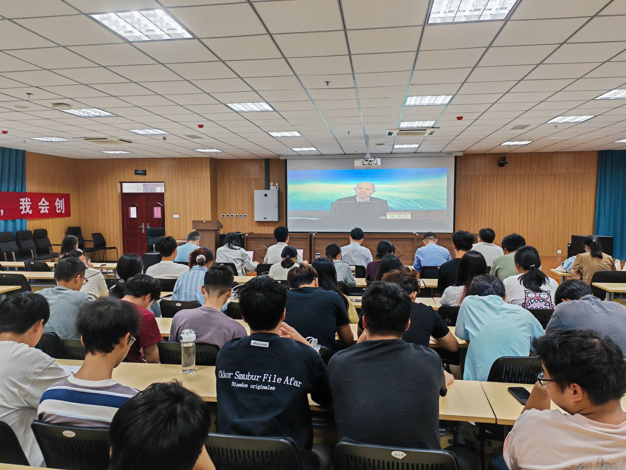 在M112报告厅设立分会场,学院领导班子成员及国际经济与贸易、金融工程和电子商务等专业师生共同参加学习。