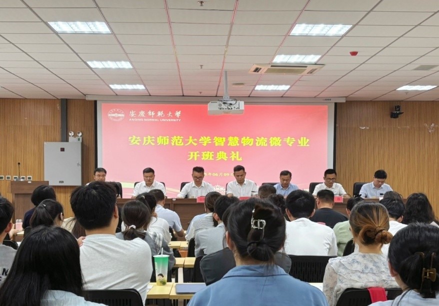智慧物流微专业正式开班。学校教务处处长潘锦云、中国邮政集团有限公司安庆市分公司、国汽朴津智能科技(安庆)有限公司、安徽运通达物流科技有限公司、安庆极铂飞航无人机科技有限公司等共建单位领导出席典礼,开班典礼由副院长梁培培主持。