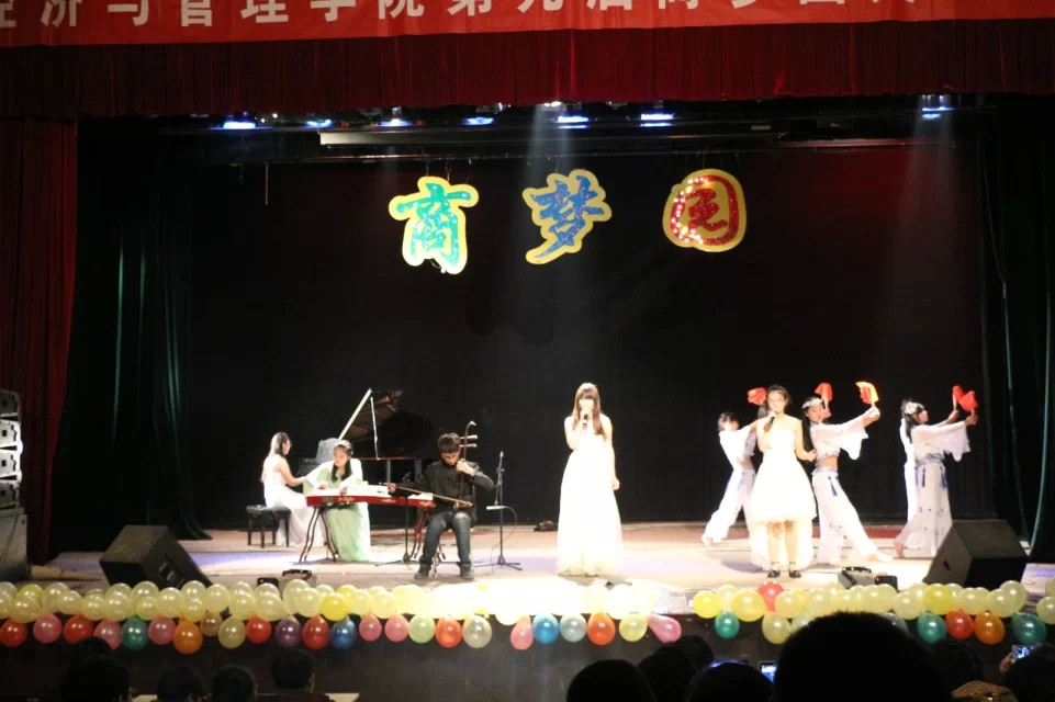 流行歌曲与安庆当地文化的结合,教职工子女代表队的歌伴舞《小苹果》展现出编舞者的创新思维,小朋友们的各种萌,令观众大呼“太可爱”。特邀嘉宾韩龙学长演唱了他独立创作的歌曲《往前走》,他以此歌激励学生们:“人生会遇到许多挫折,而我们就要学会跌倒爬起来,然后继续向前走。”晚会的高潮还是要数器乐合奏歌伴舞《穿越时空的思恋》。以钢琴、古筝、二胡三种乐器伴奏,两位女生以柔和的歌声伴着轻盈的舞步,加上舞台的烟雾效果,让观众仿佛置身于梦境之中。