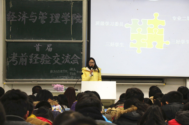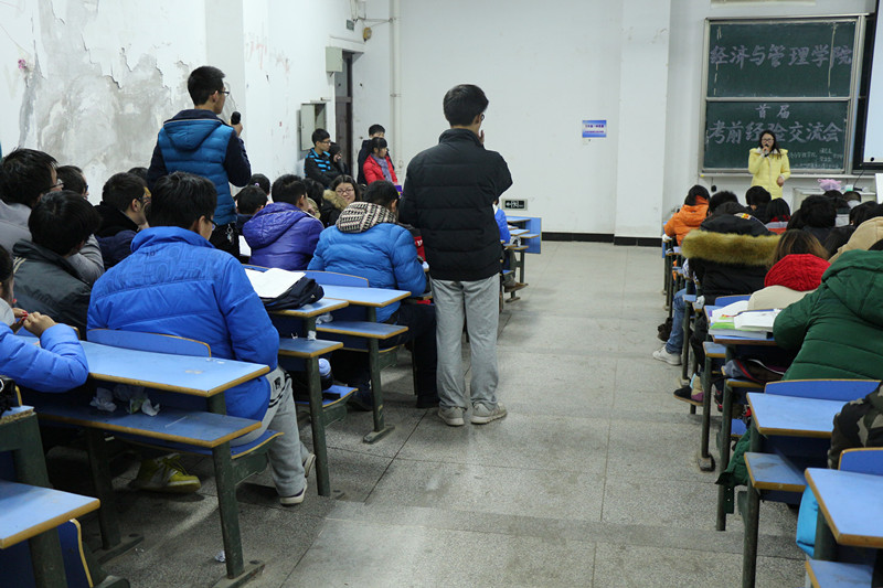 “你不逼自己一下,永远也不知道自己有多优秀。”13级彭蔷薇分别就英语、高数、政治经济学、会计学原理详细介绍了自己的备考方法。“多训练”、“三大问题,重在总结”、“将注意力集中在考试”、“重在理解”……各学科的方法让在场的同学们受益匪浅。同时,“大学四年后,在学校前的公园散步,结果迷路了”这一幽默的话语不仅建议了同学们多锻炼身体,也活跃了现场的气氛。另一位学生代表张晓辉则强调了备考时态度的重要性,她认为“从现在开始,循序渐进的学,认真的对待考试”。而相比较之前嘉宾们的经验,夏青则强调合作互助意识。例如,向学霸借笔记、与同学们互助学习。在场的同学们就背书、数学建模等问题向其提问。整场交流会座无虚席,气氛既轻松又愉快。