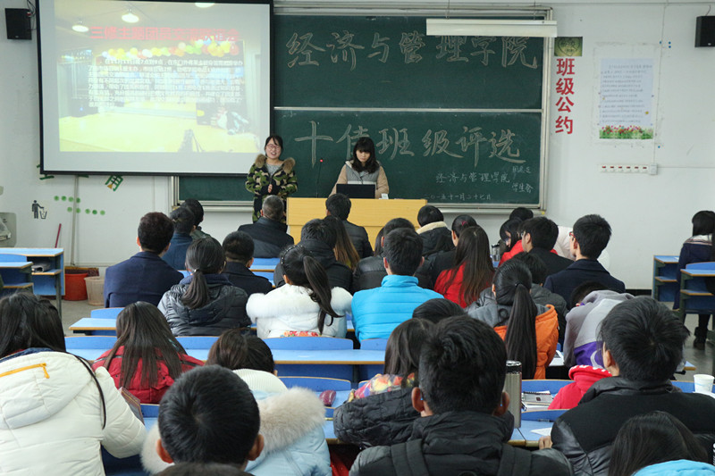 “作为学院‘2+2’中美合作的首届,我们很珍惜这种带头模范的机会。”13级国际经济与贸易合作班的解说员声情并茂的说着。在他们班,创业可谓是特色,学习成绩也没有落后。13级财务管理三班利用新媒体普及专业知识,班级建设特色鲜明,成果显著。最终,13财管3班、14金融2班、14物流2班、13市营1班获得学院先进班集体称号。