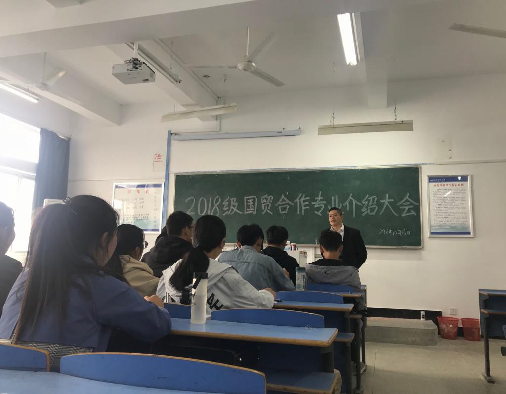 殷老师由分析近期中美贸易摩擦及中国外贸发展状况入手,引出中国对国际经济与贸易人才的渴求,认为本专业就业前景十分广阔。他详细介绍了本专业人才培养目标,对同学们今后的学习提出了具体要求。由于专业的特殊性,国合专业学生将有两年国外学习安排,殷老师向大家介绍了美国索尔兹伯里大学的教学环境与留学要求。他强调英语是学习的重点,提倡多看,多听,多说。会议的最后,殷老师号召大家主动学习,积极实践,多多参与相关学生赛事活动,为成为卓越的专业人才而努力。