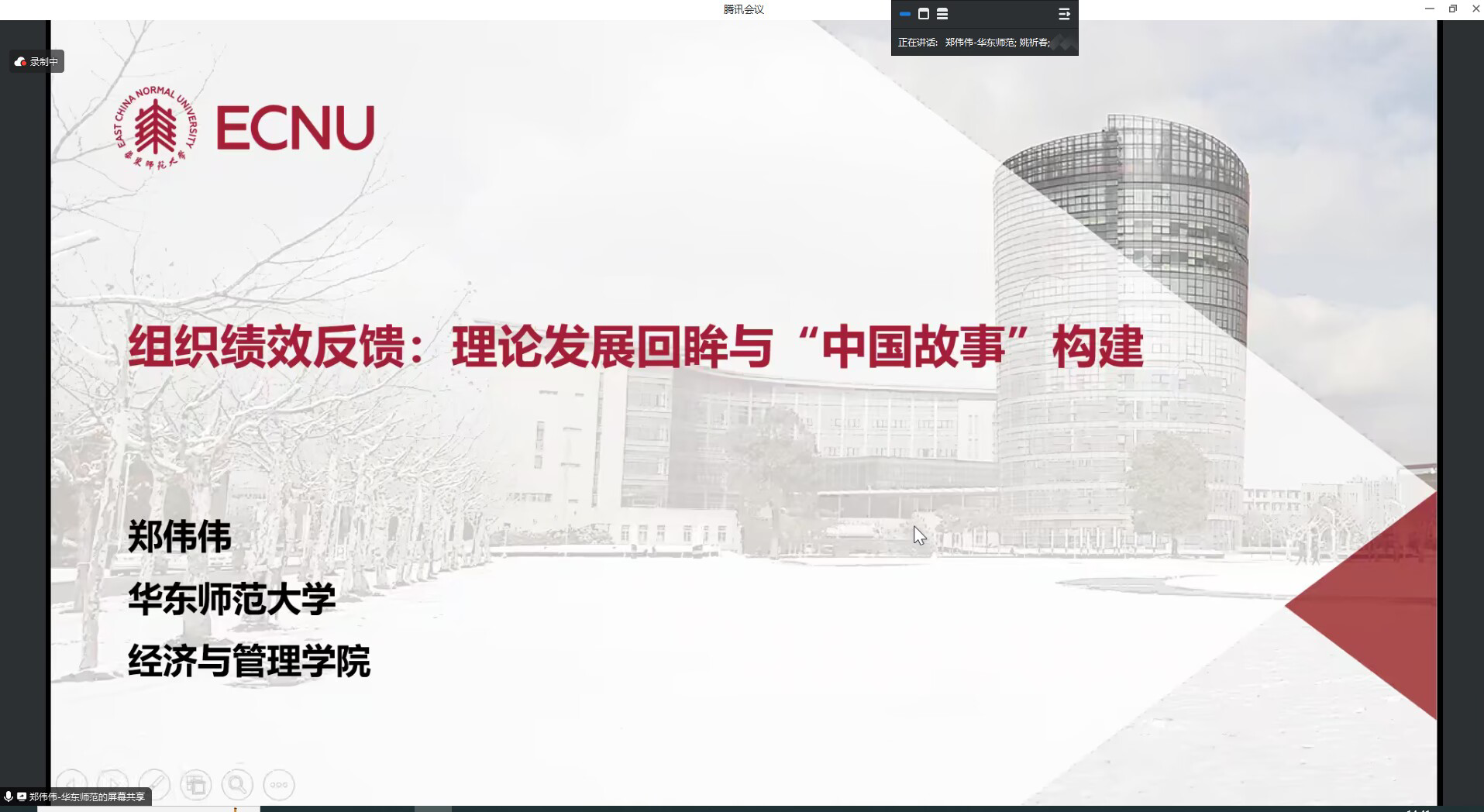 主办、区域经济与城乡发展研究所和学院研究生党支部联合承办的研究生学术交流活动“优博讲坛”第13期开讲,来自华东师范大学的郑伟伟博士在线分享了题为《组织绩效反馈:理论发展回眸与“中国故事”构建》的学术报告,全体统计学、国际商务研究生、部分老师和本科生参加了交流活动,本次讲坛由姚祈春博士主持。