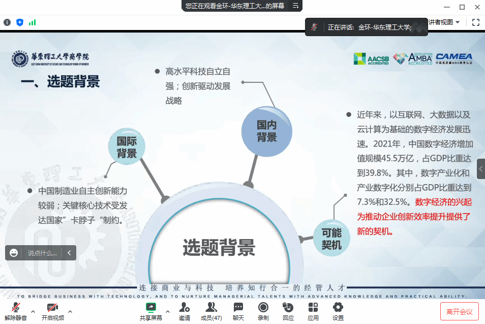 主办、区域经济与城乡发展研究所承办的研究生学术交流平台“优博讲坛”第10期开讲,来自华东理工大学的金环博士在线分享了题为《数字经济、要素市场化与企业创新效率》的学术报告,全体统计学研究生、本科生及部分老师参加了交流活动,讲坛由丁玉龙副教授主持。