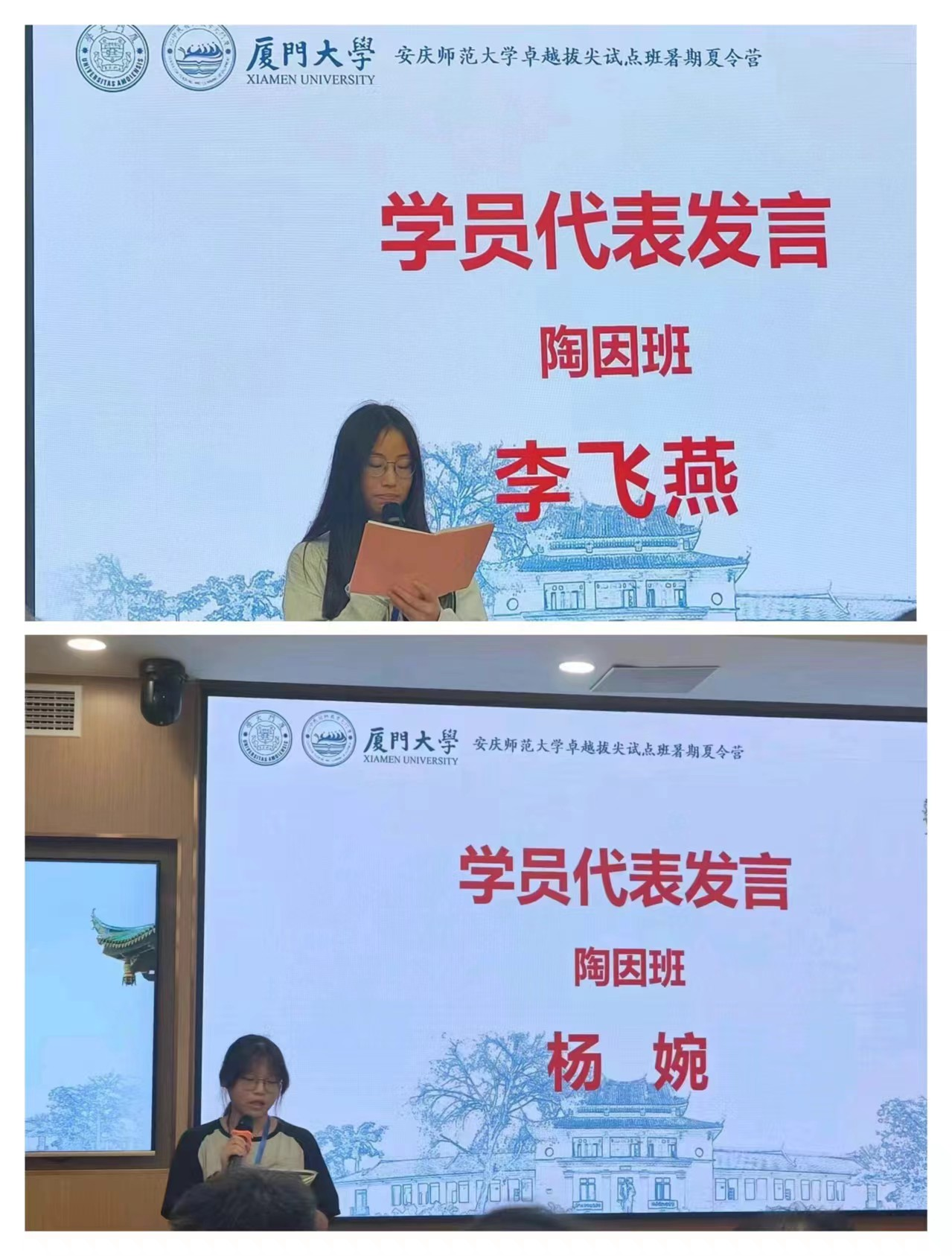 闭幕式上,杨婉、李飞燕同学作为陶因班学生代表进行发言,她们表示参加此次夏令营活动收获颇丰,不仅开阔了眼界,见识到厦门大学独特的教学风采,还清晰认识到了自己的不足,树立了远大目标使自己的人生目标更加清晰。最后厦门大学校务委员会副主任、教师发展中心主任计国君教授进行总结讲话。