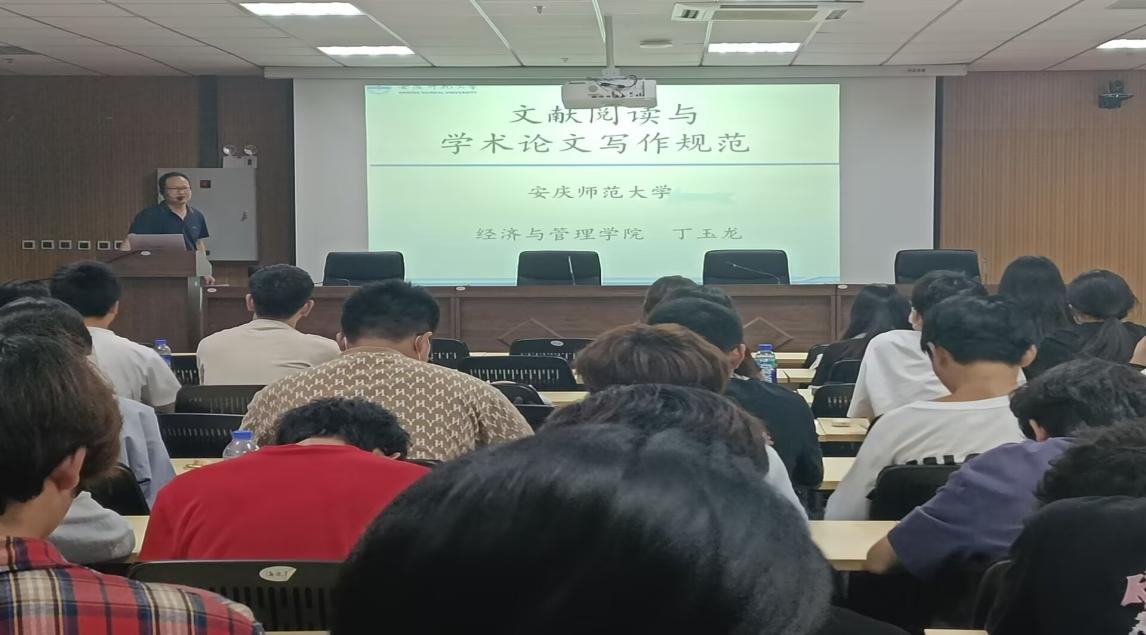 丁玉龙副教授以“文献阅读—选题来源—论文写作—文献分享”为逻辑主线,分模块展开讲解。首先,介绍文献检索、阅读与整理的方法、技巧,建议同学们要多读文献。其次,讲解学术论文选题的来源,要注重选题的理论与现实意义。再次,介绍学术论文的结构、写作要点与规范。最后,以一篇实证论文为范本,对论文的框架和内容进行剖析,让同学们认识并掌握实证论文的写作范式。