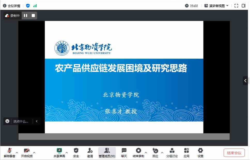 邀请,通过线上方式分享了题为“农产品供应链发展困境及研究思路”的学术报告,学院青年老师、研究生及相关专业本科生共90余人参加了交流活动,报告会由徐俊杰教授主持。