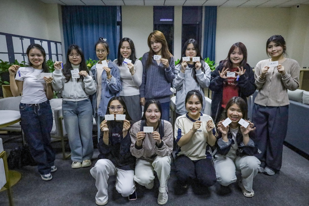 活动伊始,一张张空白卡片分发至12名来自越南的留学生手中,“邀请”她们写下属于自己的校园初印象。“我对学校的第一印象是占地面积大且风景优美。”“学校有美味的麻辣烫和很多可爱的流浪猫。” 物流管理专业2025级国际班的阮皇明舒分享道:“到校以来,令我印象最深刻的是老师的亲切和同学的热情。”她表示,尽管偶尔存在语言沟通的障碍,却依旧能感受到大家发自内心的友善。
